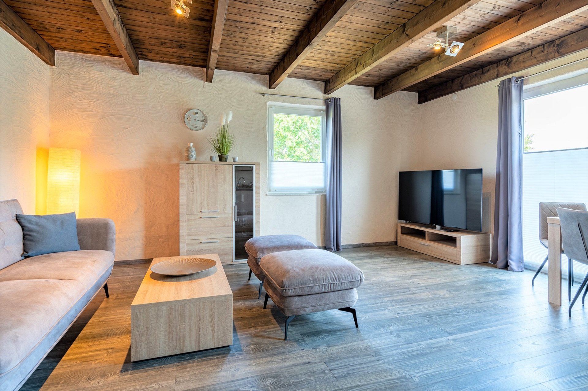 Der Wohnzimmerbereich mit der offenen Küche lädt zu geselligen Stunden ein. Die Küche ist modern und komplett ausgestattet mit einem Cerankochfeld, Backofen, Kühlschrank und Geschirrspüler. Zusätzlich stehen zwei Sätze Geschirr und Besteck sowie ein Toaster und ein Wasserkocher zur Verfügung. Für Kaffeeliebhaber gibt es sowohl eine klassische Kaffeemaschine als auch eine Kaffeepadmaschine (Senseo). Ein großer, ausziehbarer Esstisch bietet Platz für gemeinsame Mahlzeiten oder spannende Spielabende zu zweit. Die gemütliche Couch lädt zum Entspannen ein, während ein 65 Zoll Smart-TV für Unterhaltung sorgt. Die zeitgemäße Einrichtung der Wohnung trägt zum Wohlfühlen bei und verspricht einen erholsamen Aufenthalt.