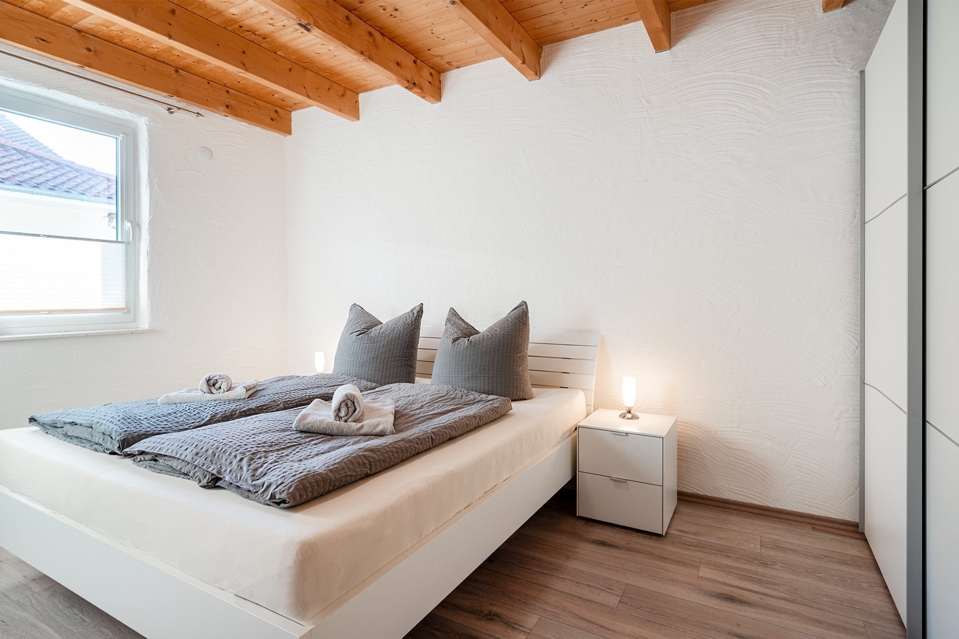 Die beiden Schlafzimmer sind mit hochwertigen Betten ausgestattet: ein Doppelbett (180x200cm) und ein Einzelbett (90x200cm). Große Kleiderschränke und Nachttische mit Nachtlampen ergänzen die Ausstattung. Auf Wunsch können exzellente Bettwäsche und Handtücher dazu gebucht werden.