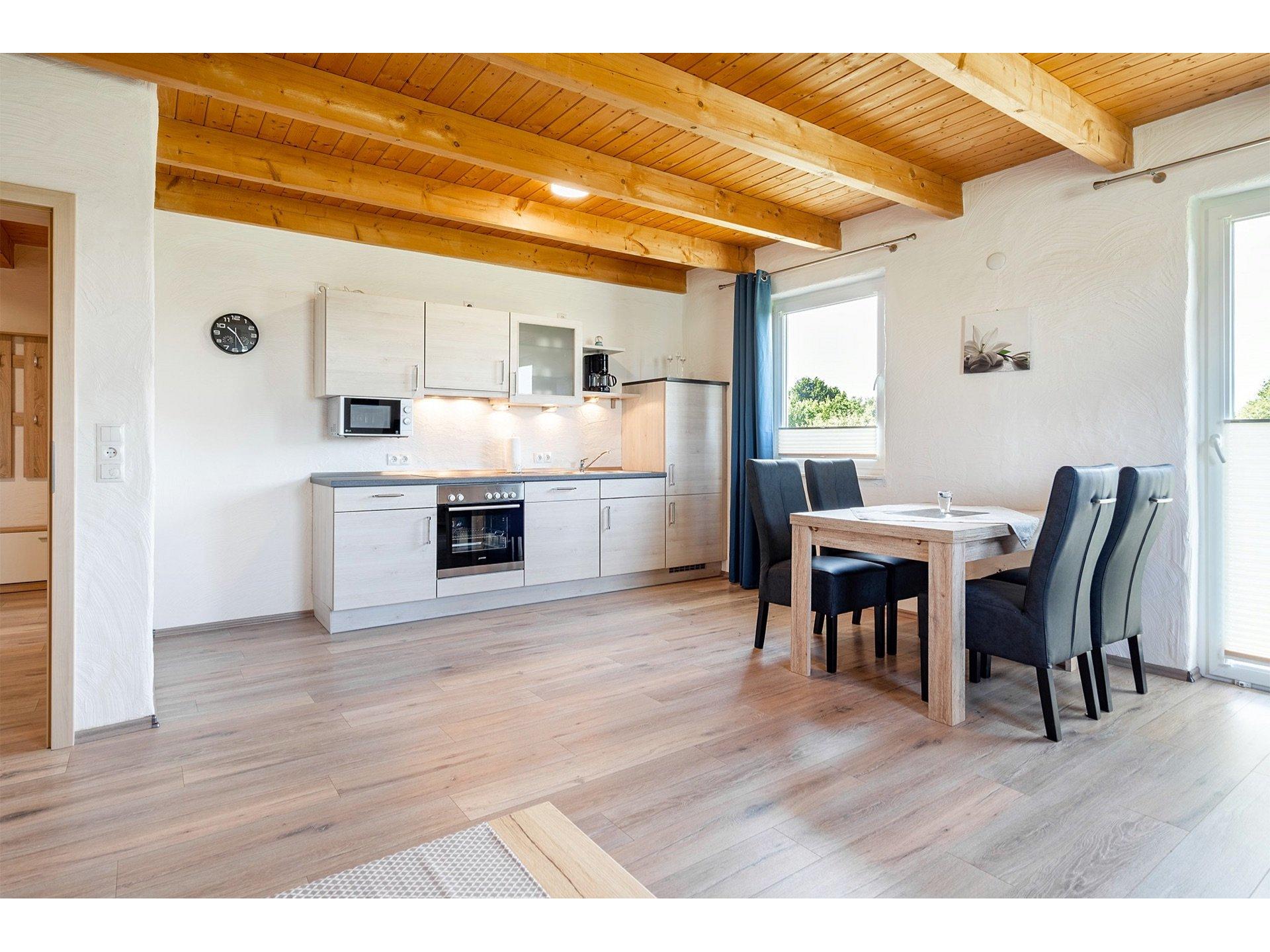 Die geräumige Ferienwohnung "Wattenmeer" bietet ein Schlafzimmer mit Platz für zwei Personen sowie einen offenen Wohnzimmer- und Essbereich und einer voll ausgestatteten Küche.